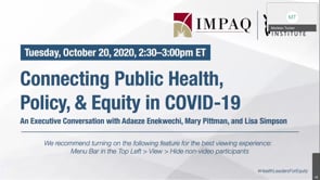 In a live conversation with Adaeze Enekwechi, Mary Pittman, and Lisa Simpson, hear first-hand how leaders from across the spectrum of research, policy, and practice are grappling with issues of health equity during the COVID-19 crisis and where they see opportunities for progress.