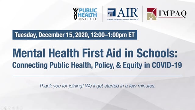 The COVID-19 pandemic has taken a toll on the mental health of all age groups. Students and adolescents report that the pandemic has had significant impacts on their mental health, as they’ve missed out on major life events and adjusted to distance learning. At the same time, the pandemic has exacerbated mental health inequities across minority and vulnerable groups, particularly among Black and Latino youth. Schools have been instrumental in providing mental health supports and interventions, even before the pandemic, and communities, policymakers, and researchers also play a role in implementing school-based mental health services. Mental Health First Aid is one such intervention that has helped schools respond to students’ mental health needs in both a low-cost and high-impact manner. How have schools and others adapted during the pandemic to address students’ mental health needs, and what will change going forward?